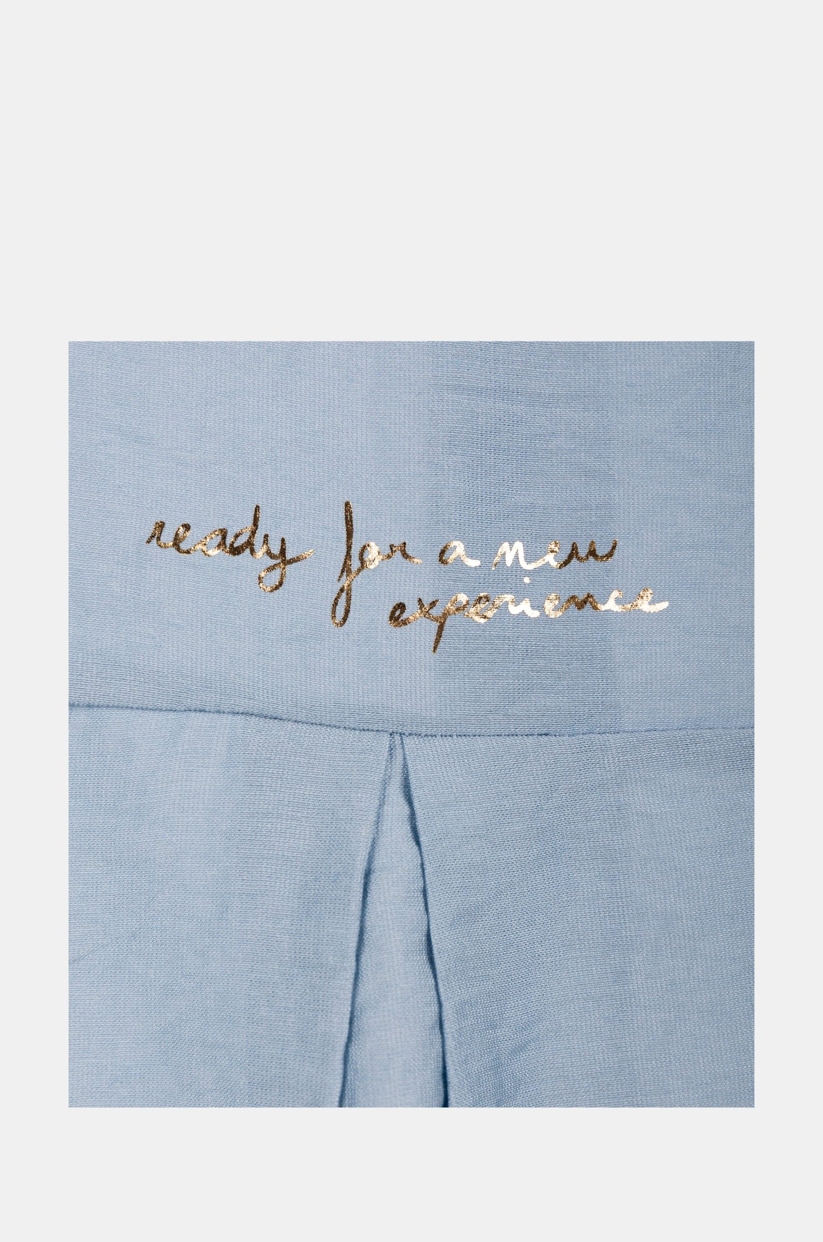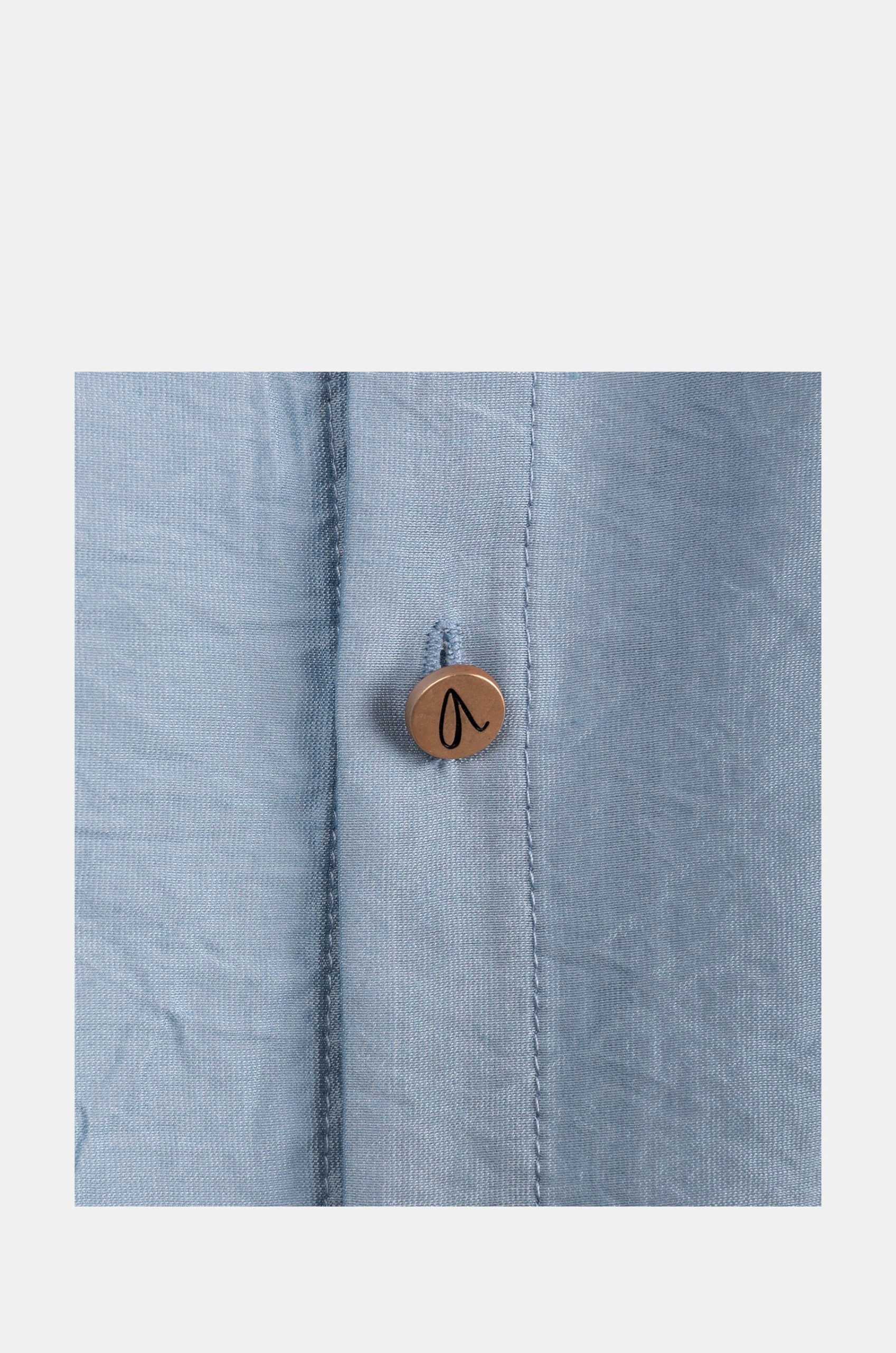 It is blue, with half sleeves and a button closure. When wearing it, style it however you want! You can wear it loose, as an over-shirt, with pants or a skirt… A myriad of possibilities to tell a little more about yourself to the world.
